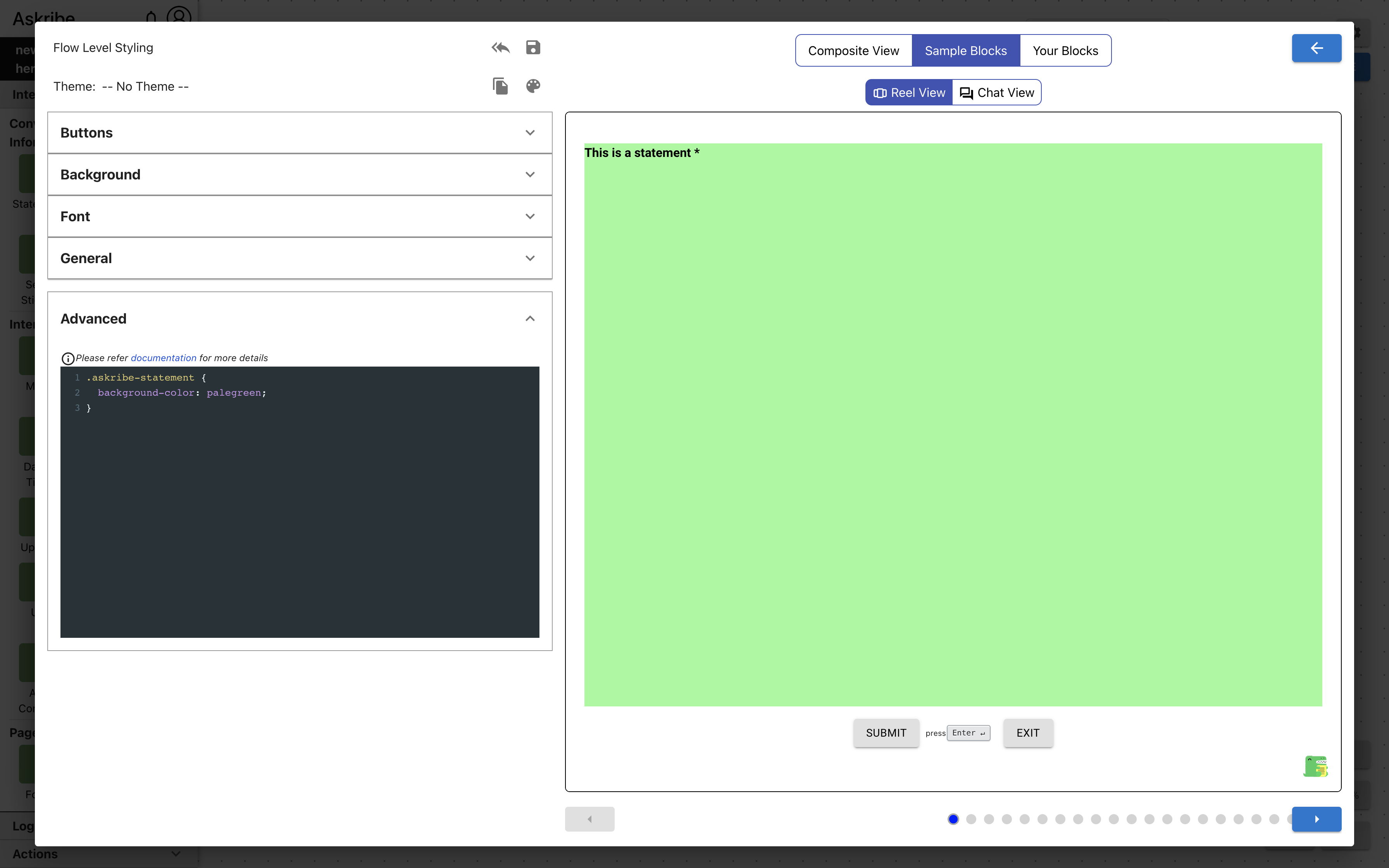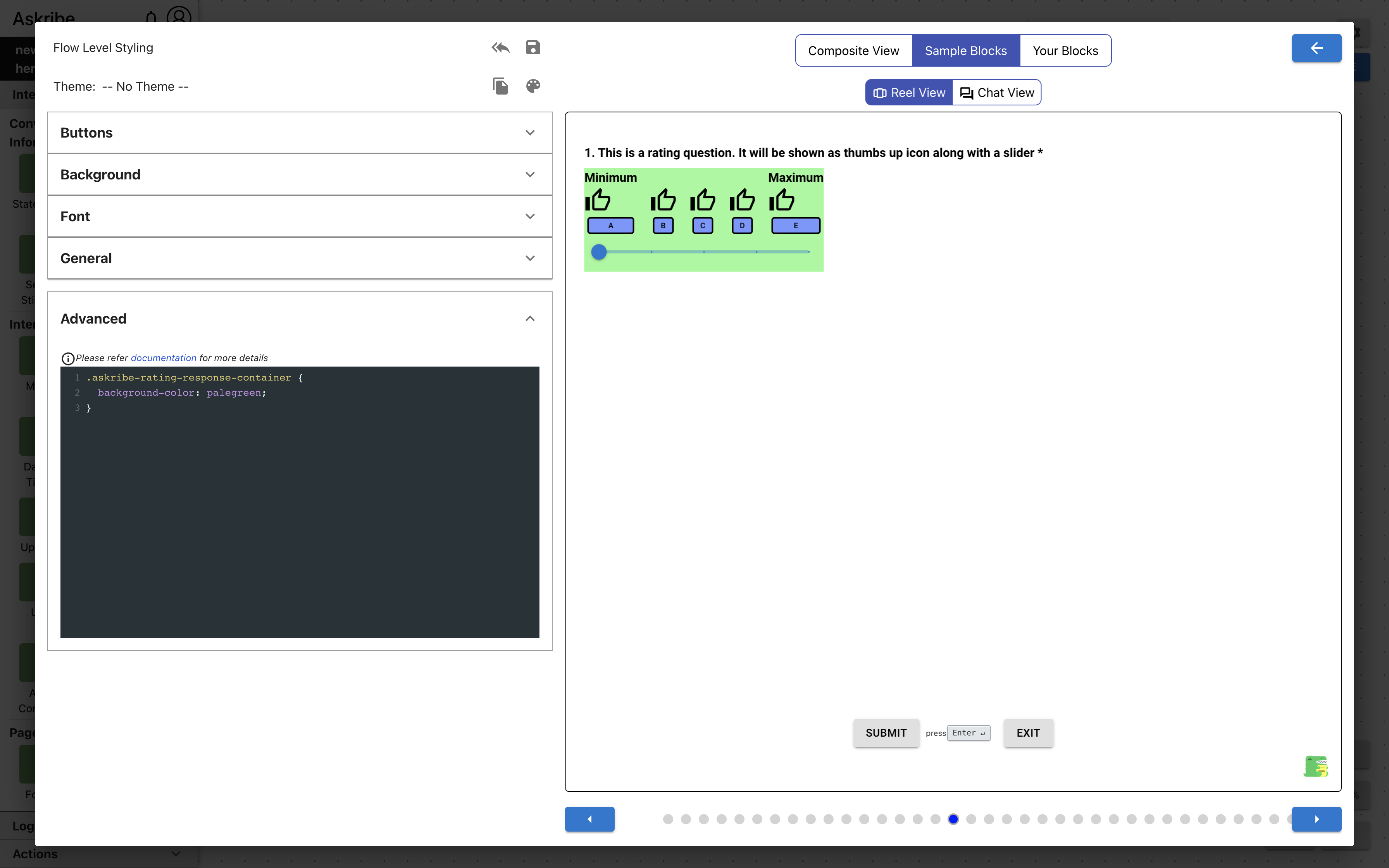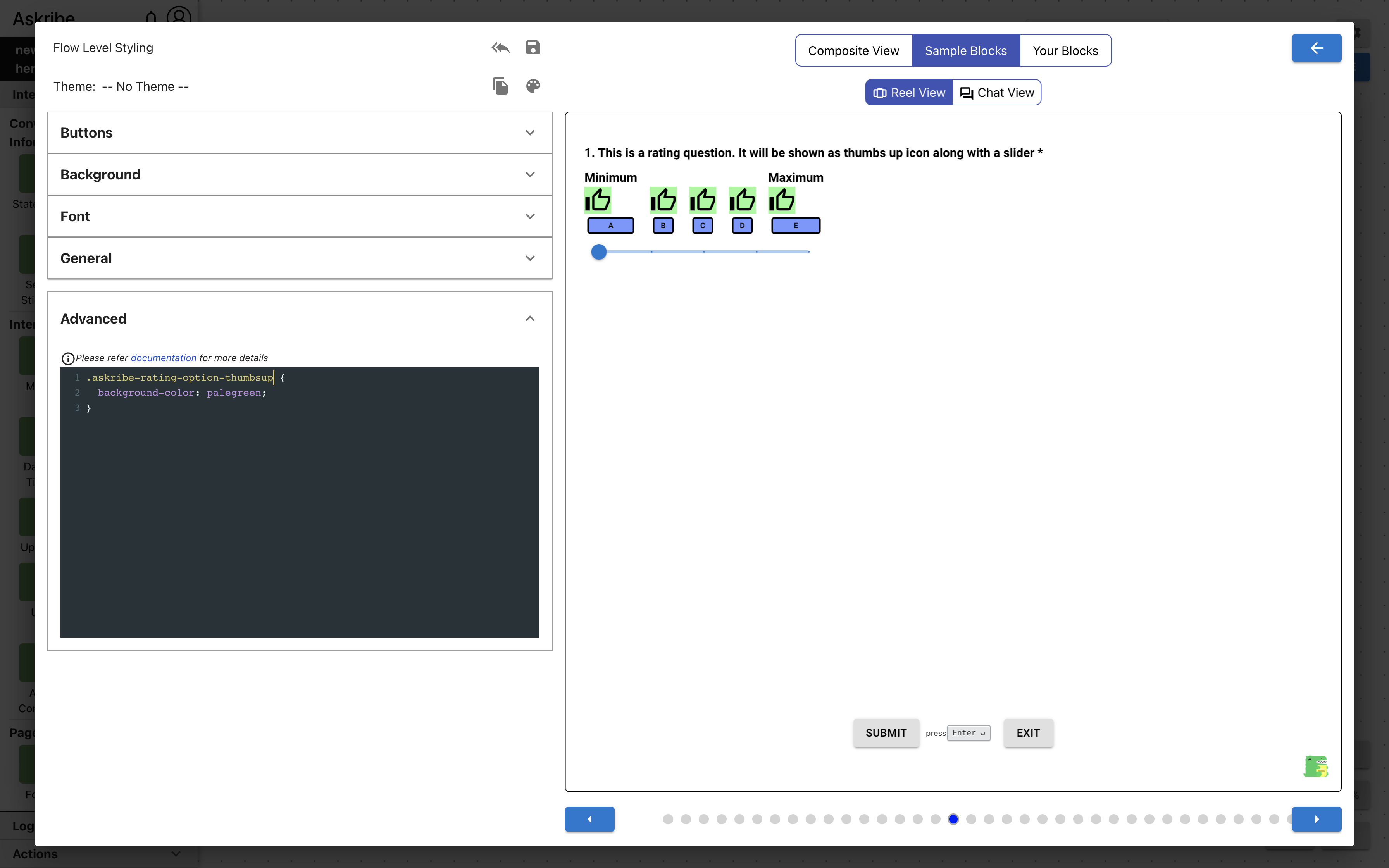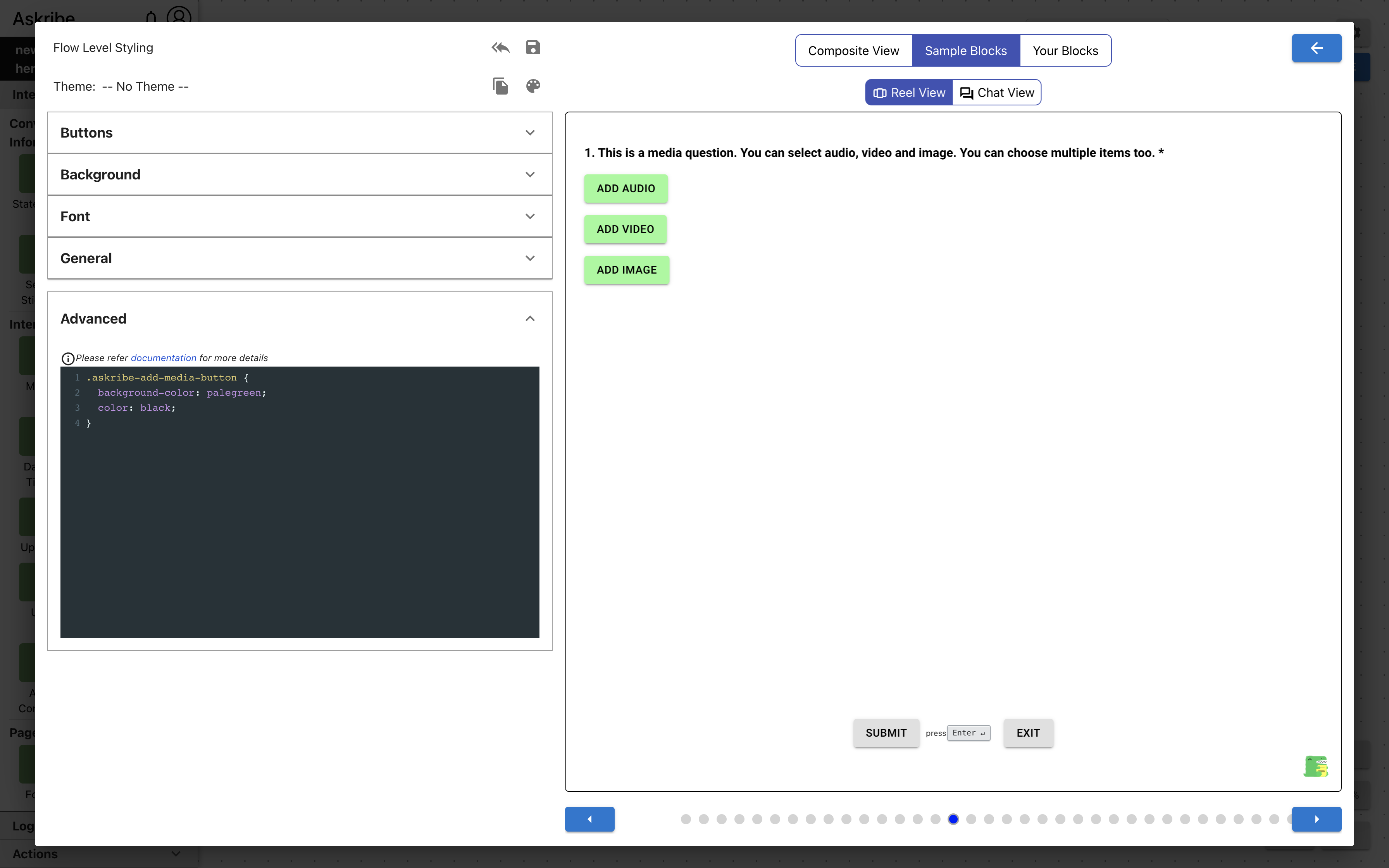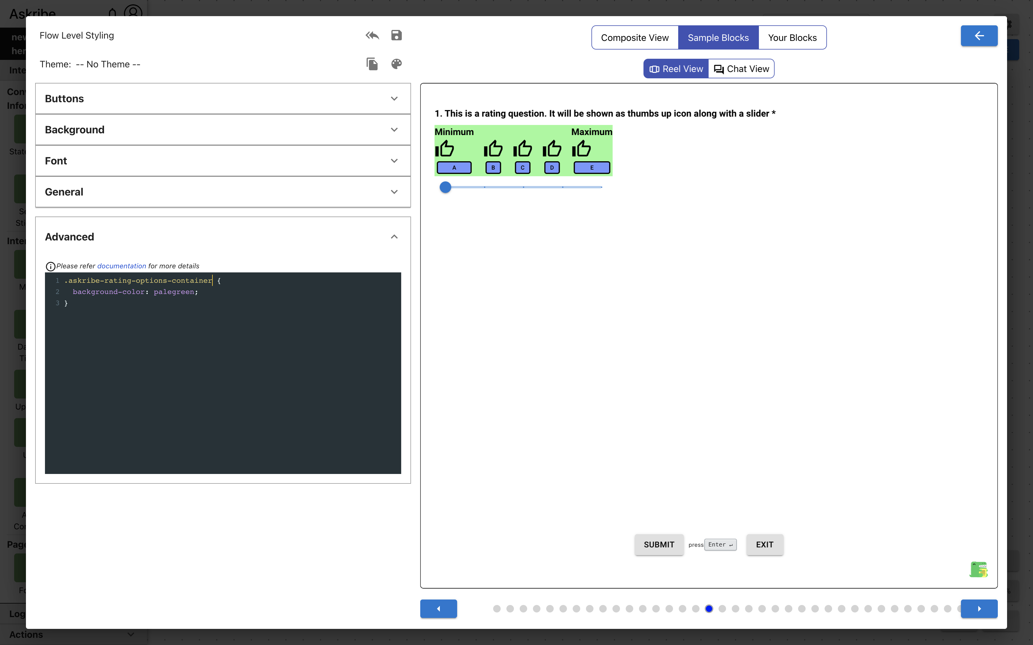 Advanced CSS is a powerful way to add more advanced and nuanced customization to Askribe consumer using SCSS code. We expose classes that are used in consumer to enable styling customization using Advanced CSS. The classes exposed are as follows. These are the classes exposed in Reel View.