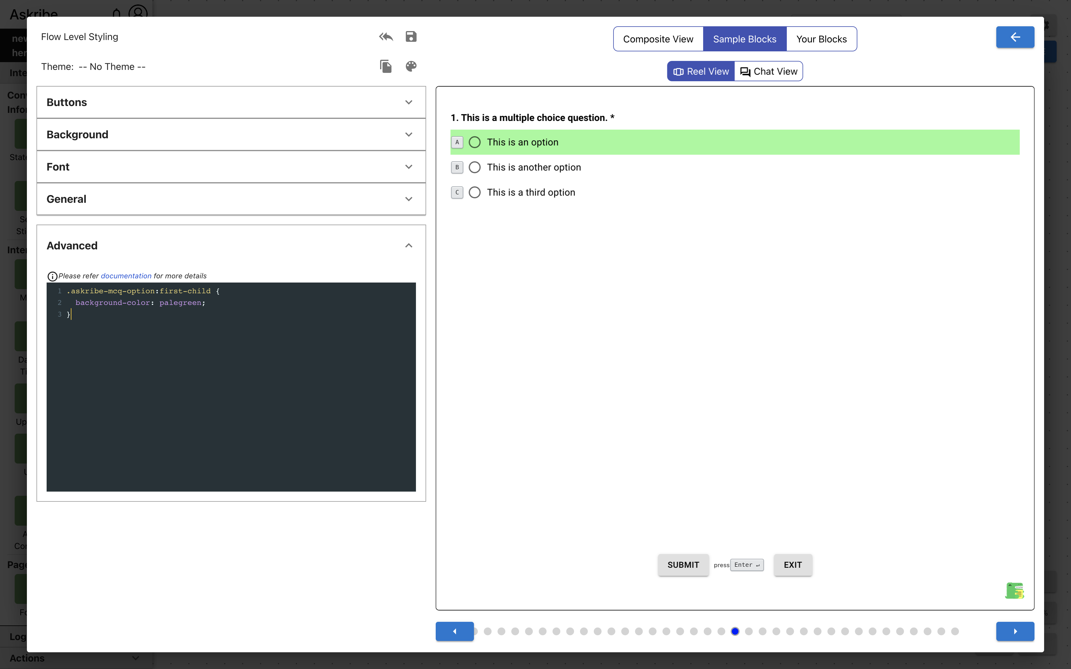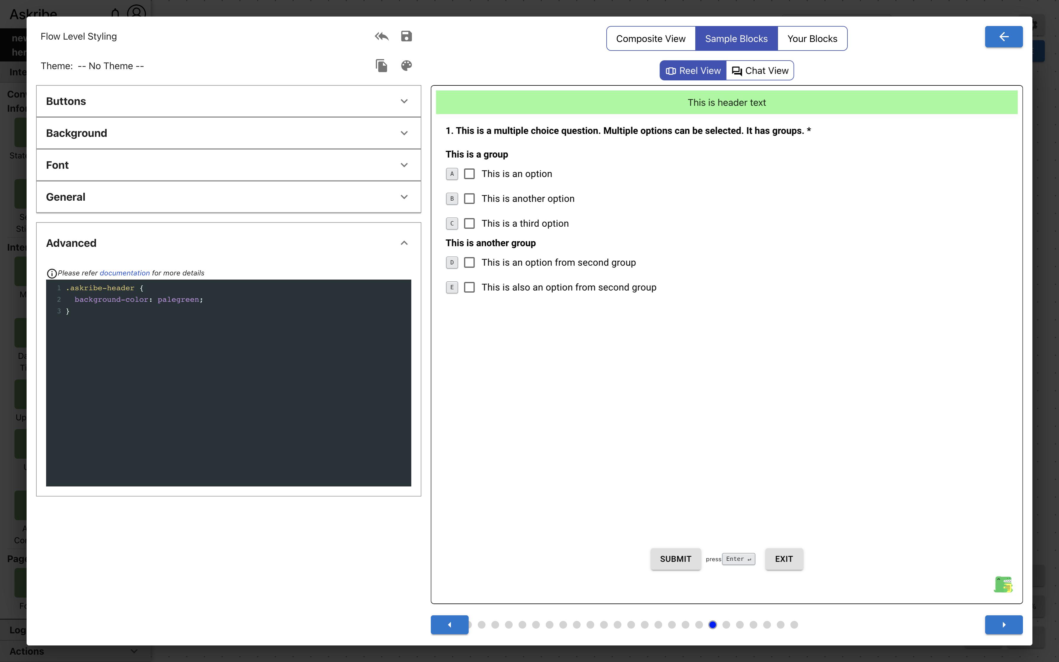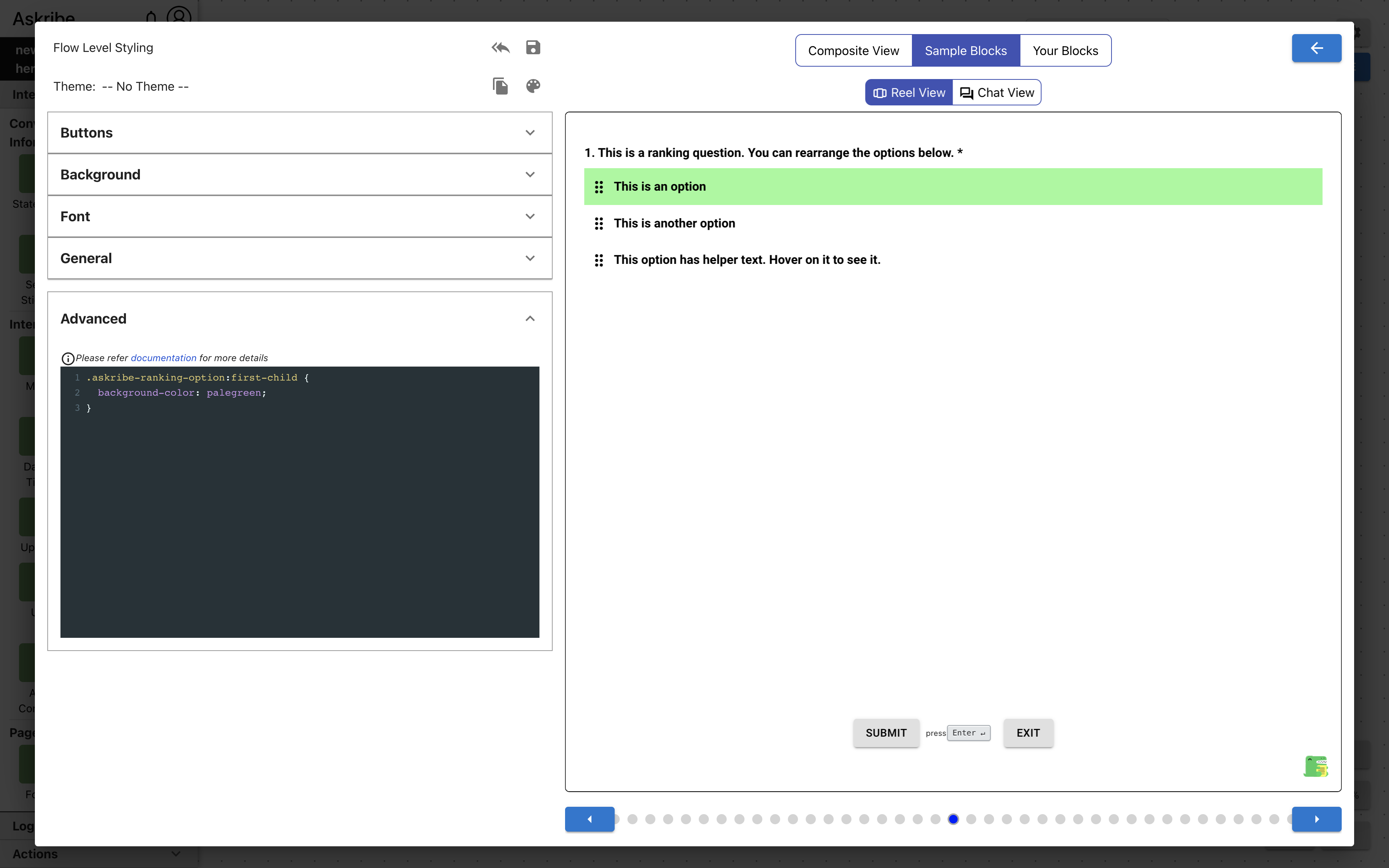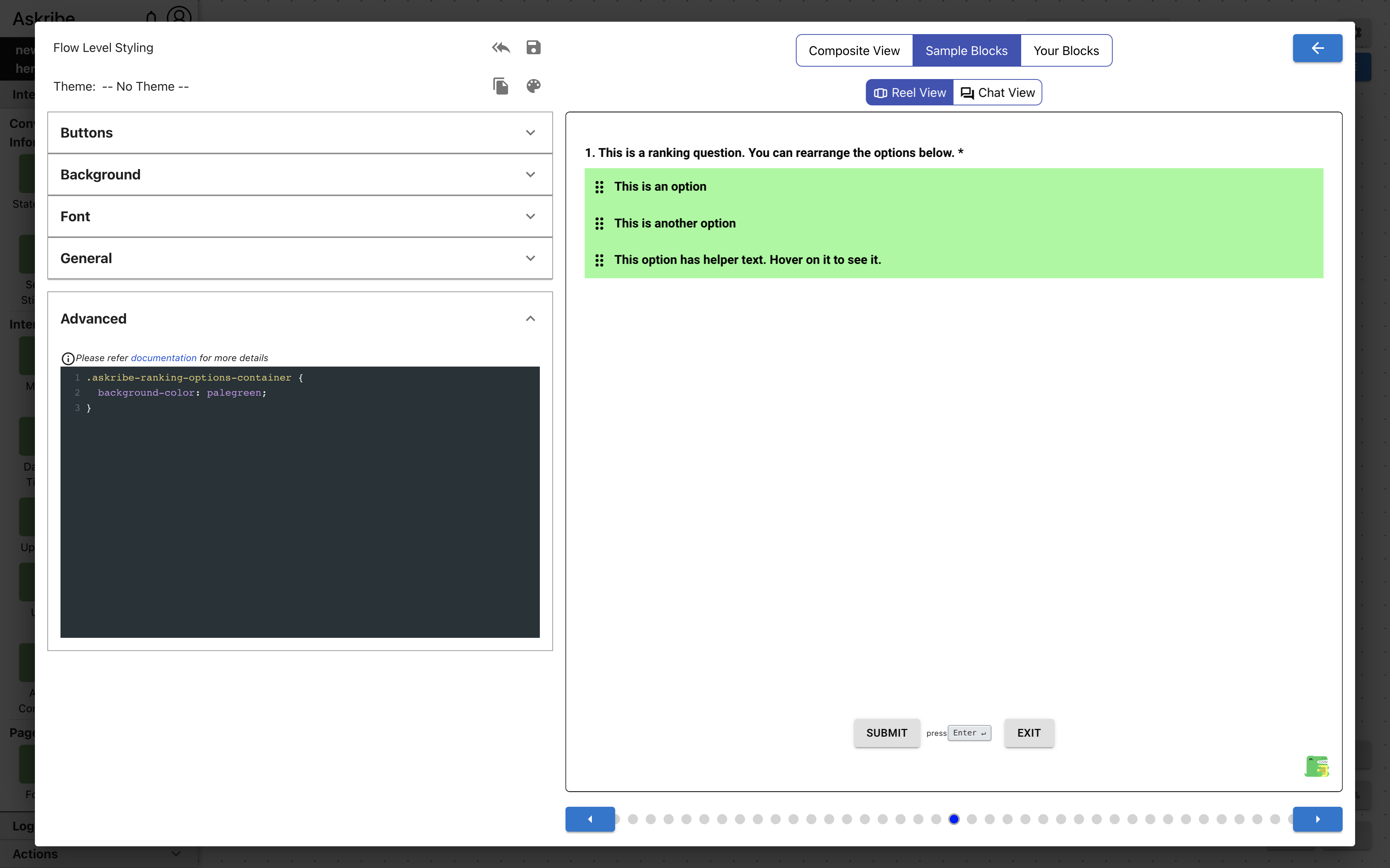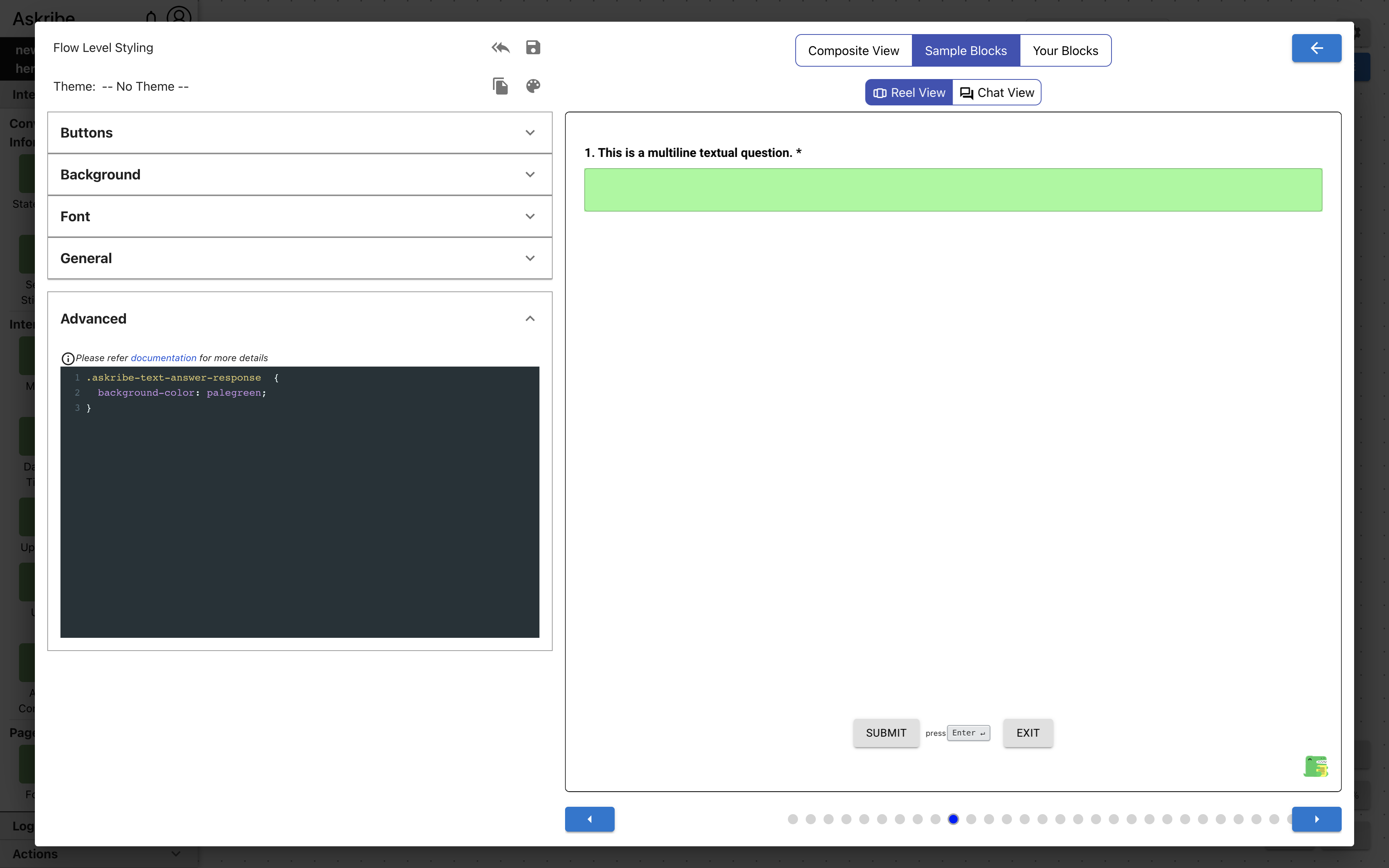 Advanced CSS is a powerful way to add more advanced and nuanced customization to Askribe consumer using SCSS code. We expose classes that are used in consumer to enable styling customization using Advanced CSS. The classes exposed are as follows. These are the classes exposed in Reel View.