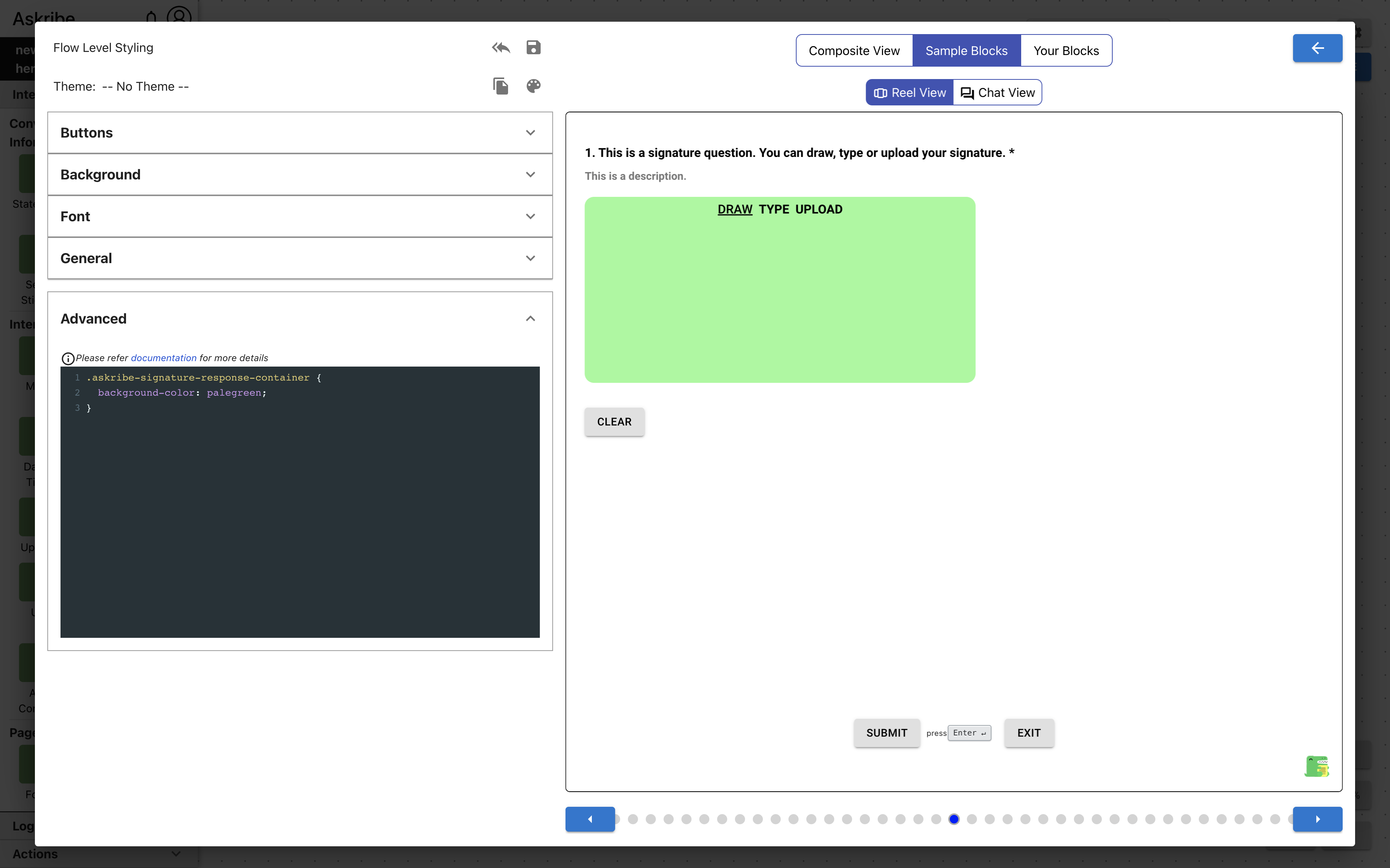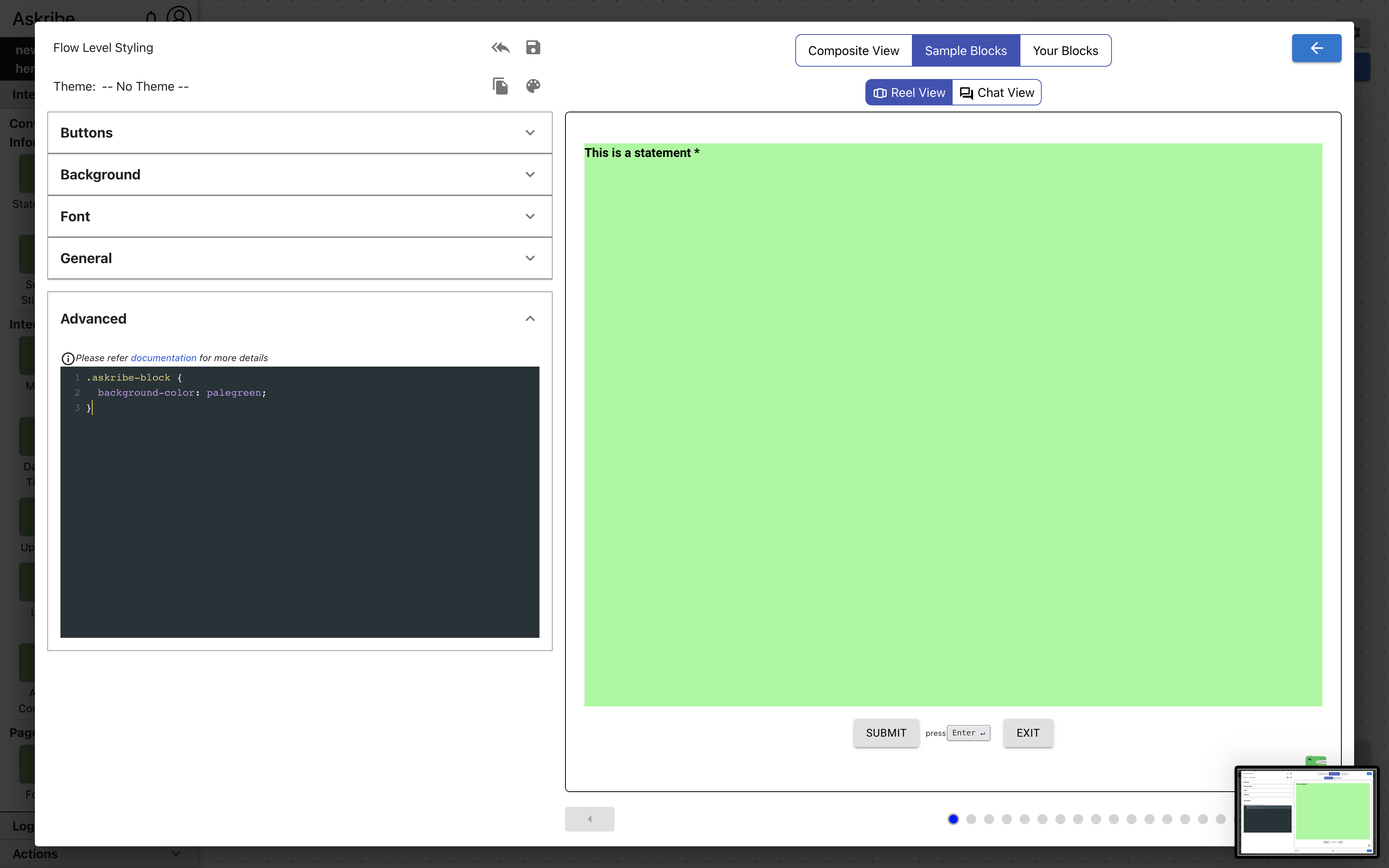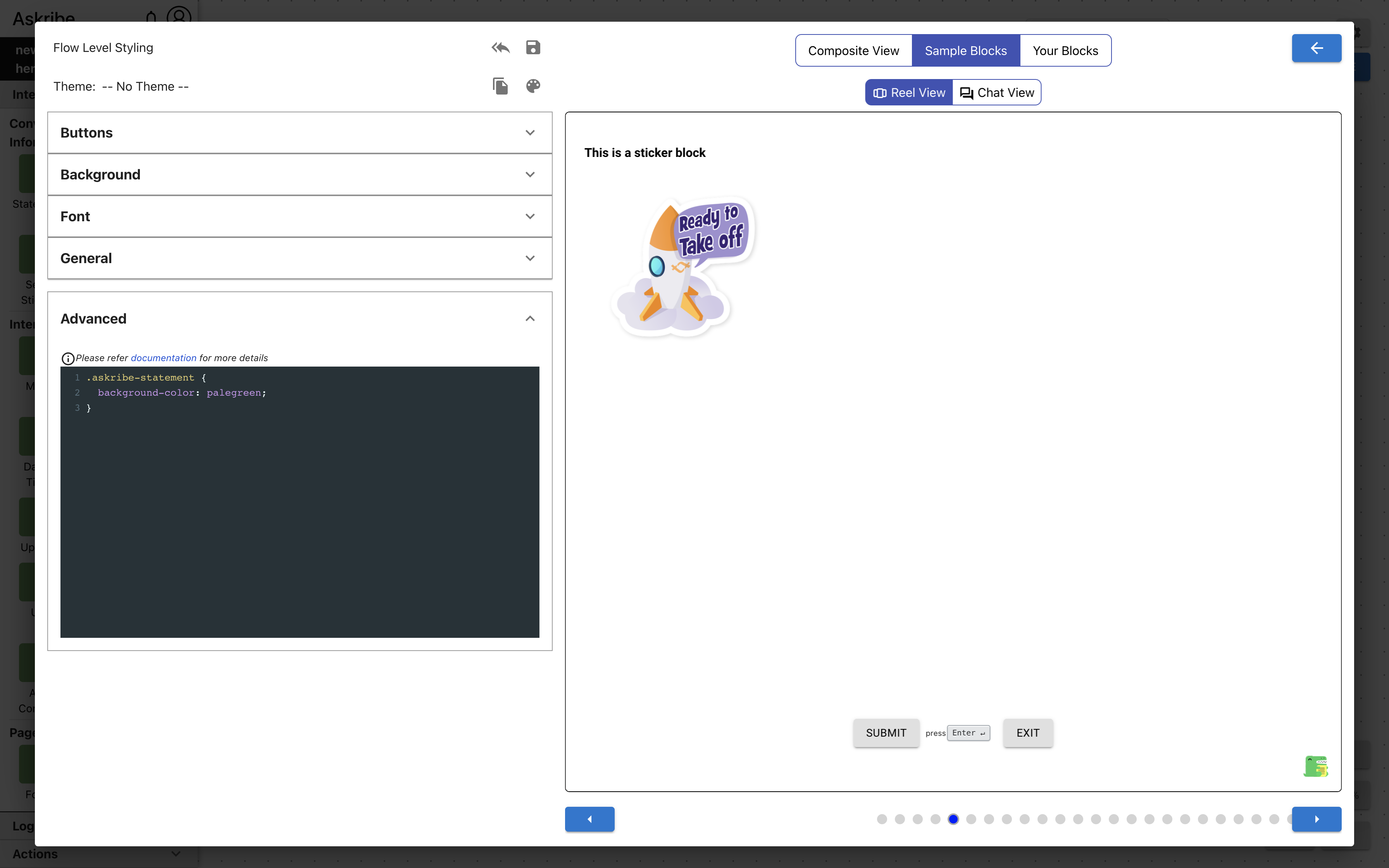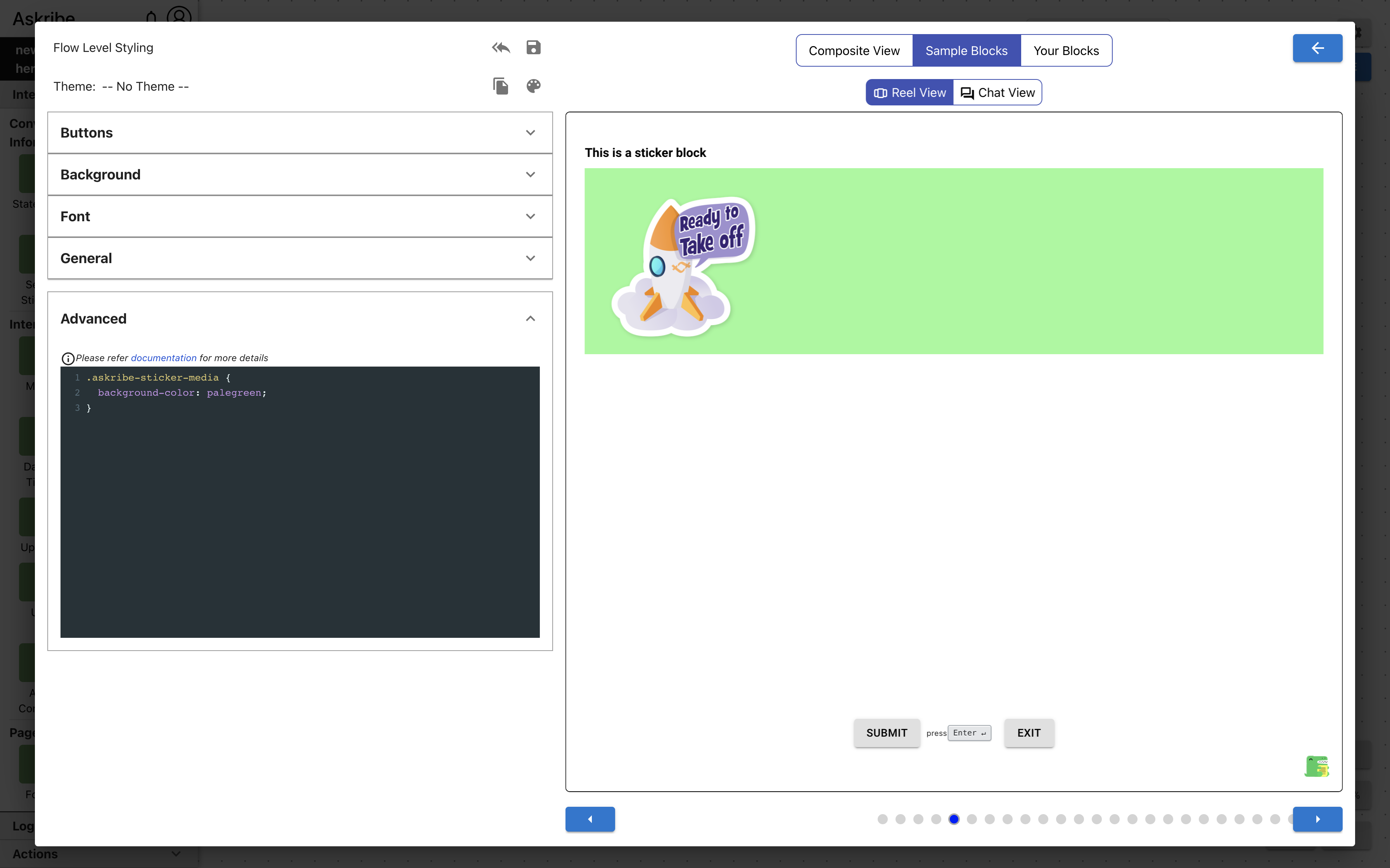 Advanced CSS is a powerful way to add more advanced and nuanced customization to Askribe consumer using SCSS code. We expose classes that are used in consumer to enable styling customization using Advanced CSS. The classes exposed are as follows. These are the classes exposed in Reel View.