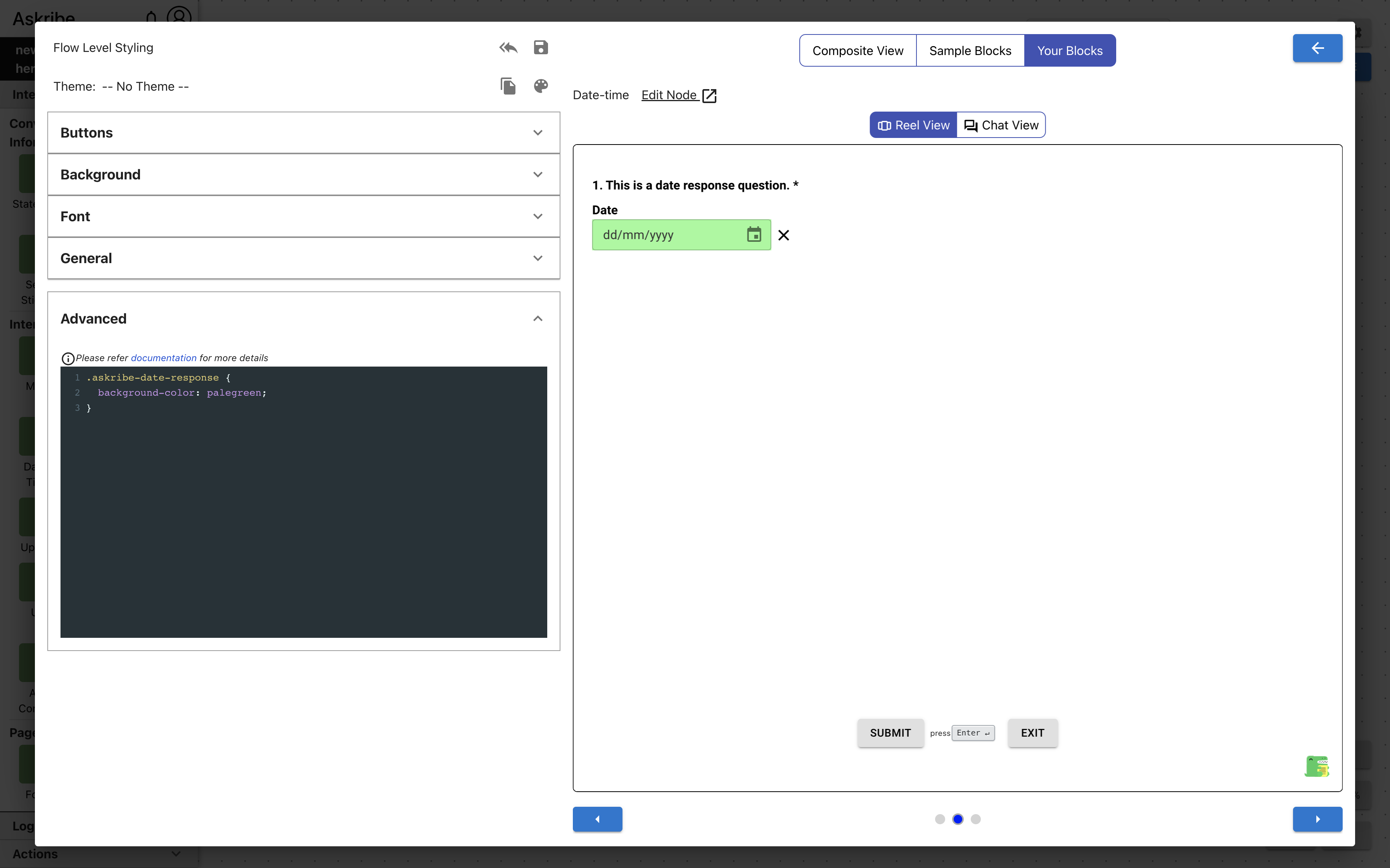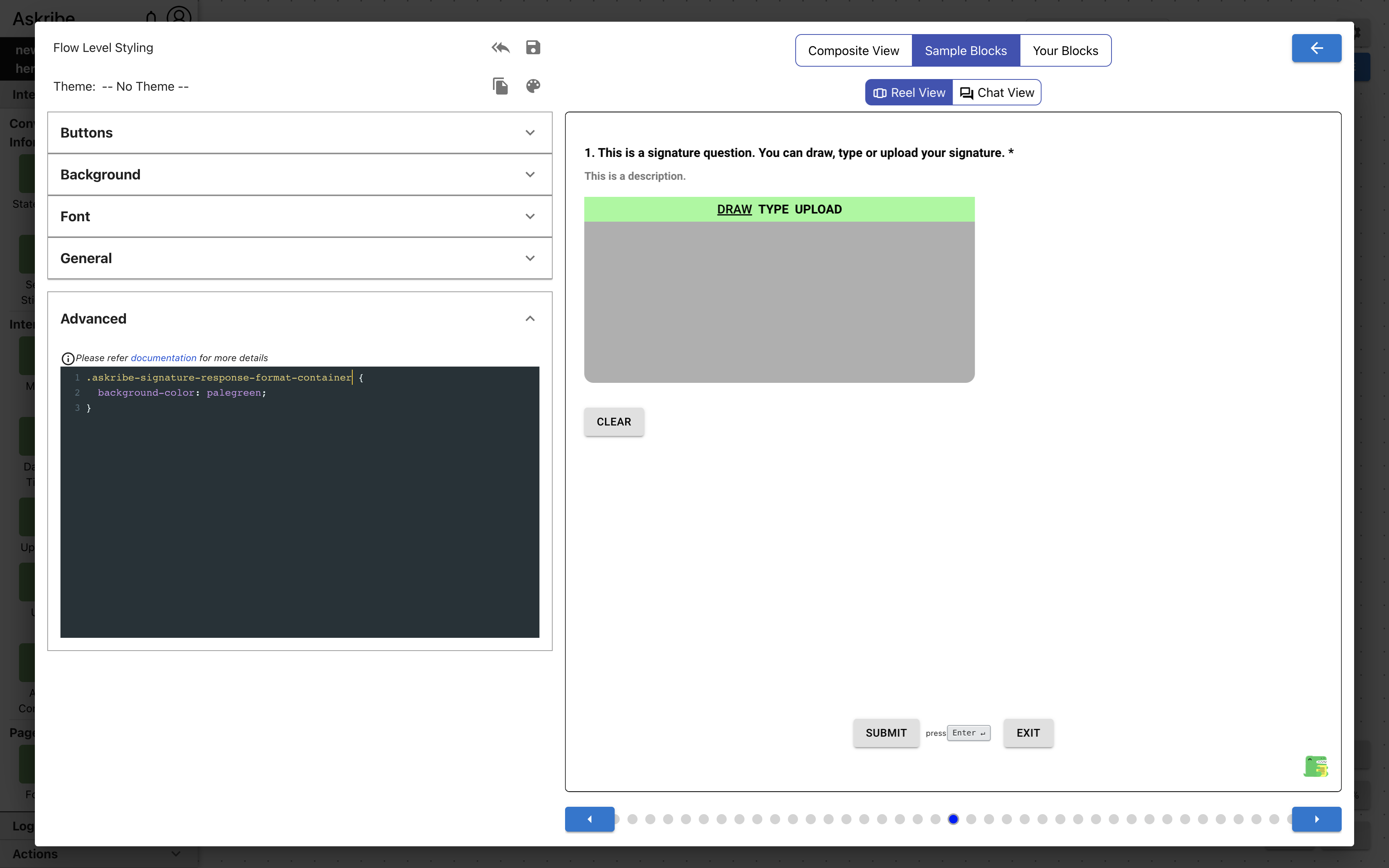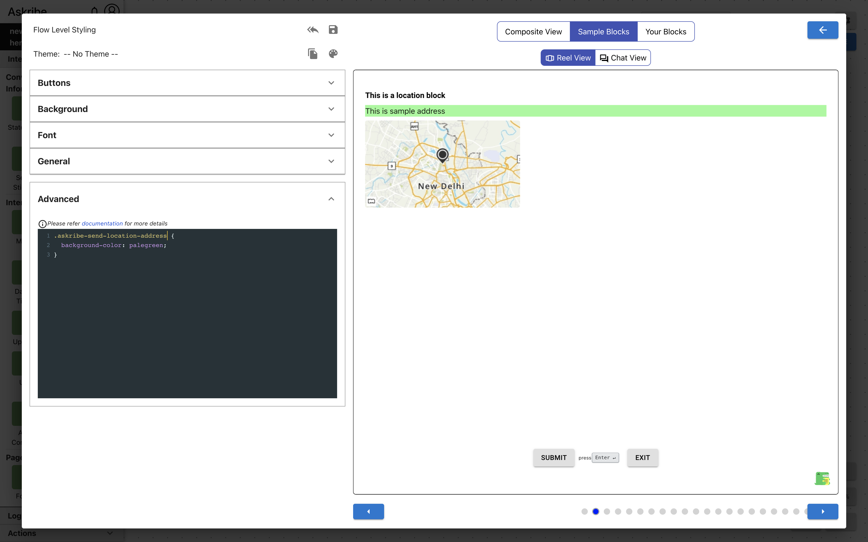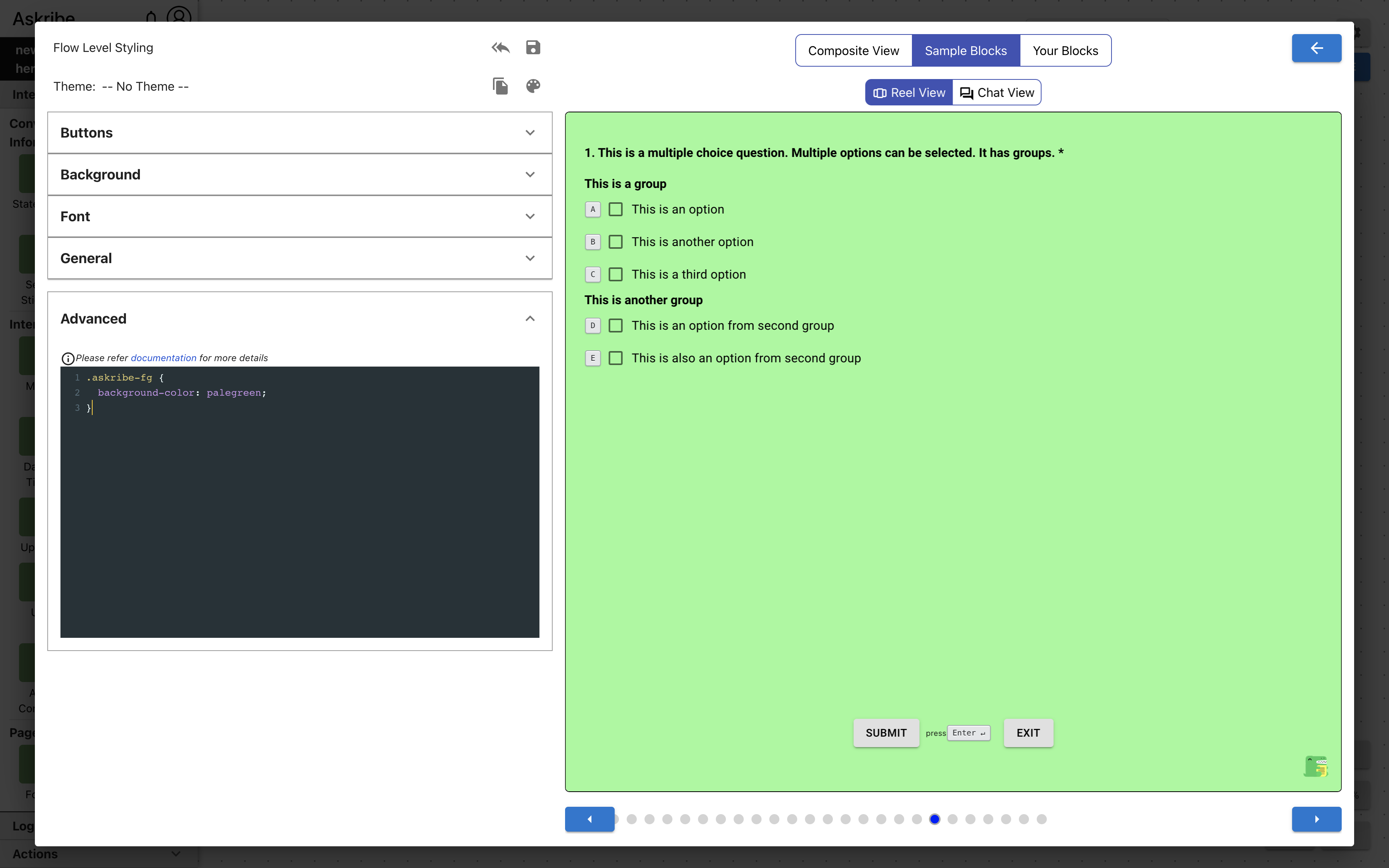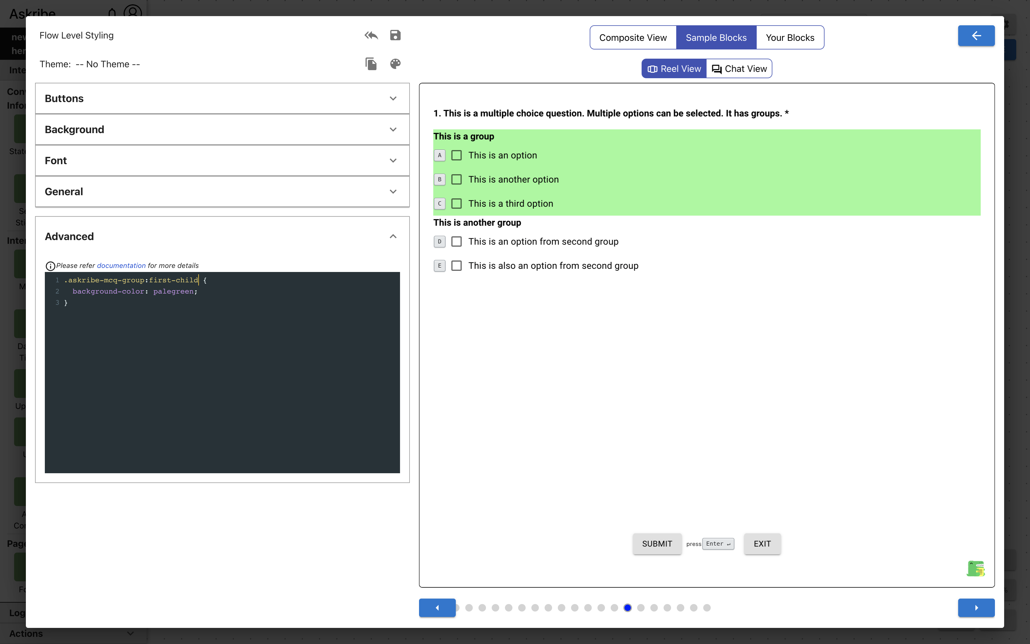 Advanced CSS is a powerful way to add more advanced and nuanced customization to Askribe consumer using SCSS code. We expose classes that are used in consumer to enable styling customization using Advanced CSS. The classes exposed are as follows. These are the classes exposed in Reel View.